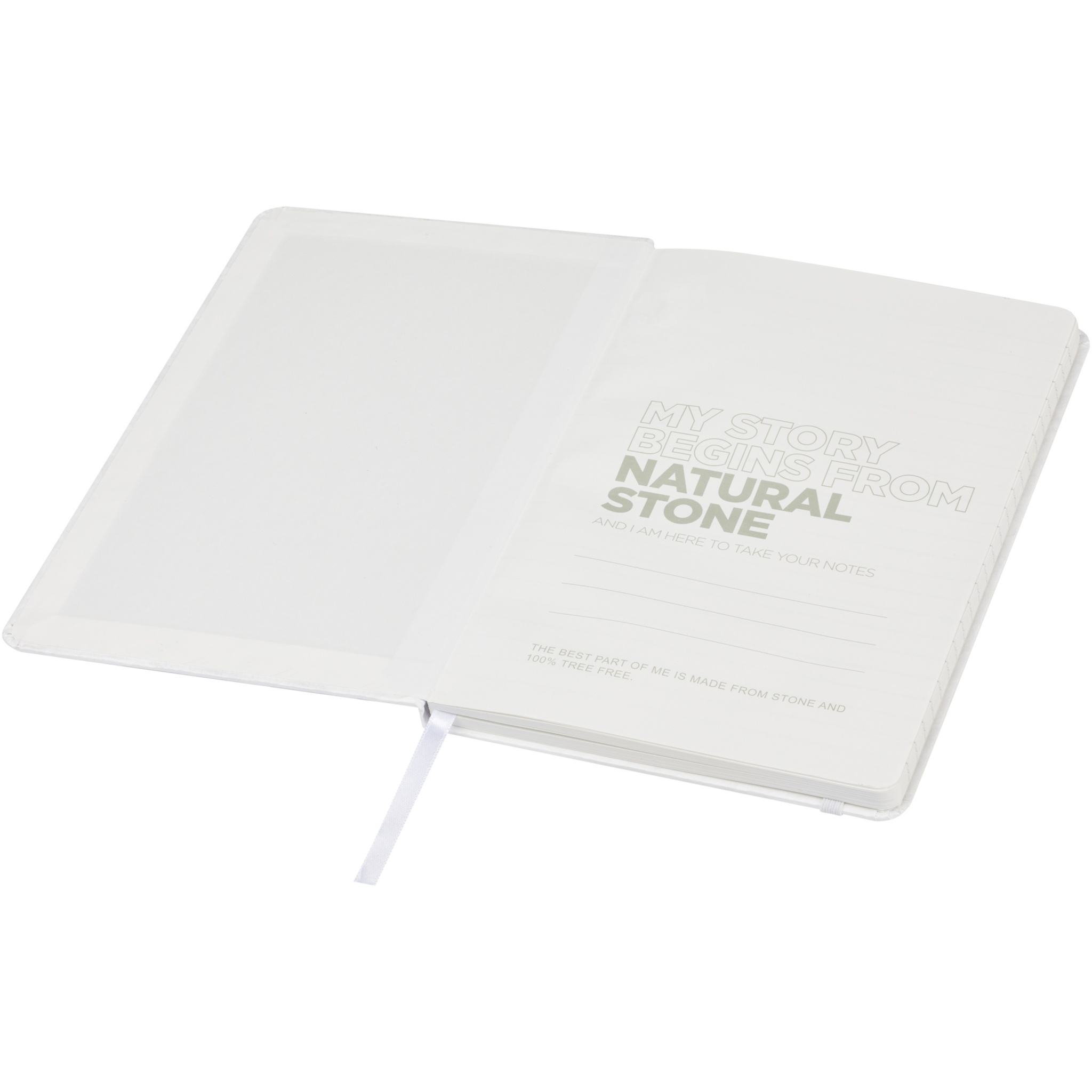 A5 storlek rivtålig anteckningsbok med inre sidor gjorda av sten. Mineralpapper är 100 % trädfritt och produktionsprocessen använder mindre energi jämfört med återvunnet eller nytt pappersmassapapper. Den är vattenresistent så vätskor som spills lätt kan torkas av. Har en färgmatchande bandmarkör och elastiskt band och 60 ark 120 g/m² linjerat mineralpapper. Inpackad i ett kartonghölje.