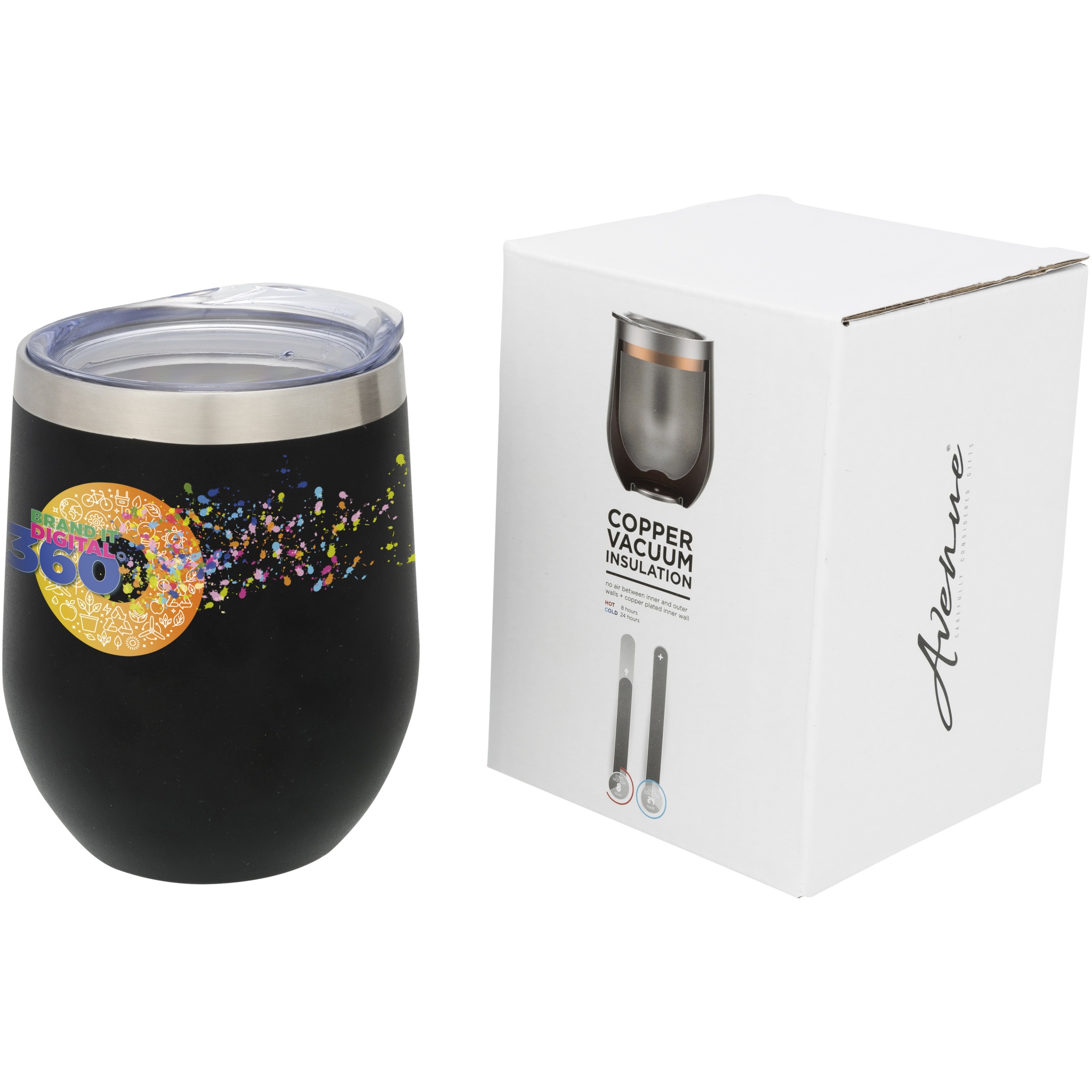Corzo kopparvakuumisolerad termosmugg. Håller din dryck varm i 6 timmar eller kall i 24 timmar. Rostfritt stål med tålig dubbelväggskonstruktion och kopparisolering. Konstruktionen hindrar också att kondens utvecklas på utsidan. Spraypulverlack på det yttre kroppshöljet. Transparent lock med bred öppning för bekväm påfyllning och hällning. Volym 350 ml. Avenue presentförpackning. Rostfritt stål.