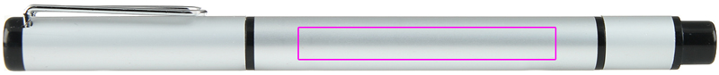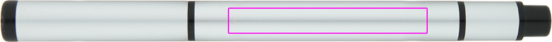 Kulspetspenna i aluminium med svartskrivande refill och gul överstrykningspenna på motsatt sida. Vi graverar din logotyp på skaftet.