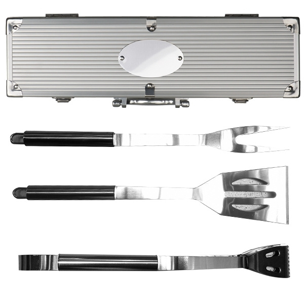 Grillfodral bestående av grilltång, köttgaffel och grillvändare i metallfodral. Vi laserar din logotyp på fodralets ovala metallplatta.