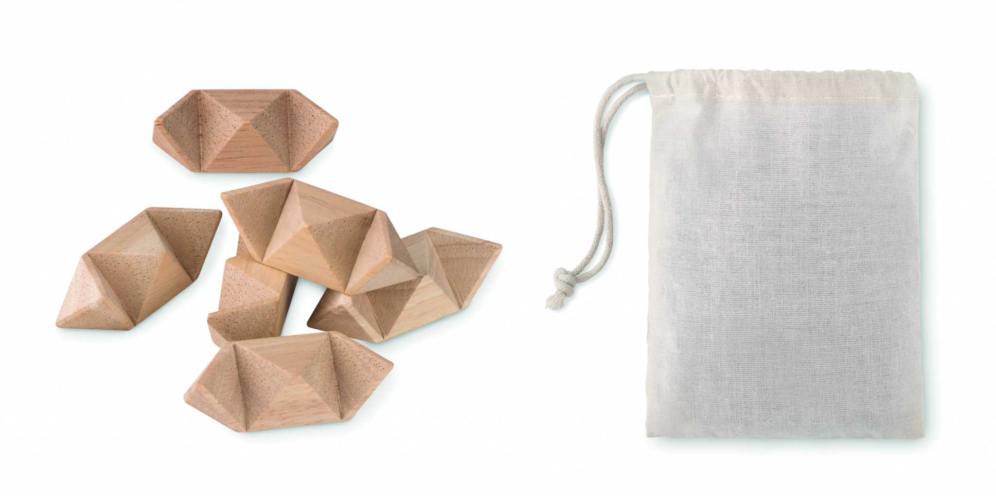 Hjärnspelet i trä i stjärnform. Presenteras i en bomullspåse.