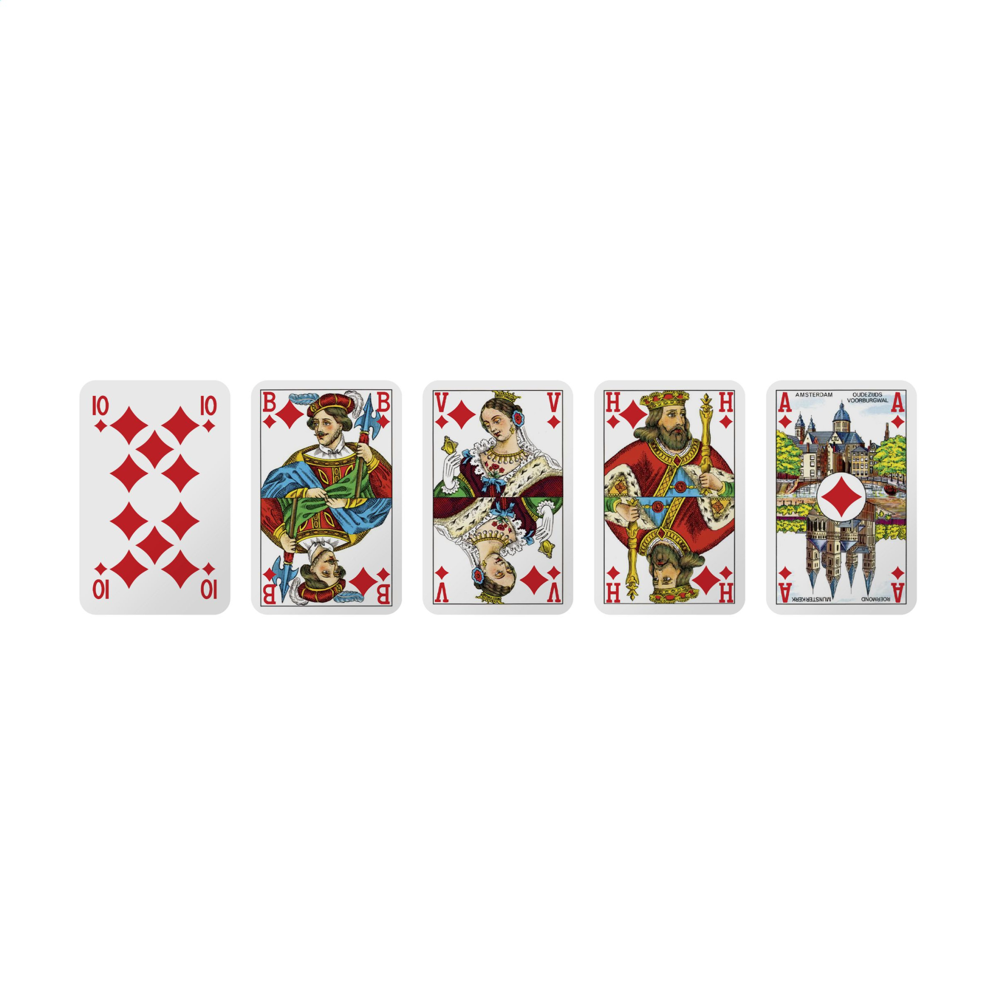 Spelkort gjorda av robust 300 grams kartong. Med holländska bilder på framsidan (A/H/V/B) och hörnmärken. Dessa kortlekar består av 52 spelkort och 2 jokrar. Förpackad i en kartong med cellofan. Du kan lägga till din fullfärgsdesign på baksidan av korten och även på kartongen, vilket skapar en unik, personlig kortlek för att marknadsföra ditt varumärke med varje spel.