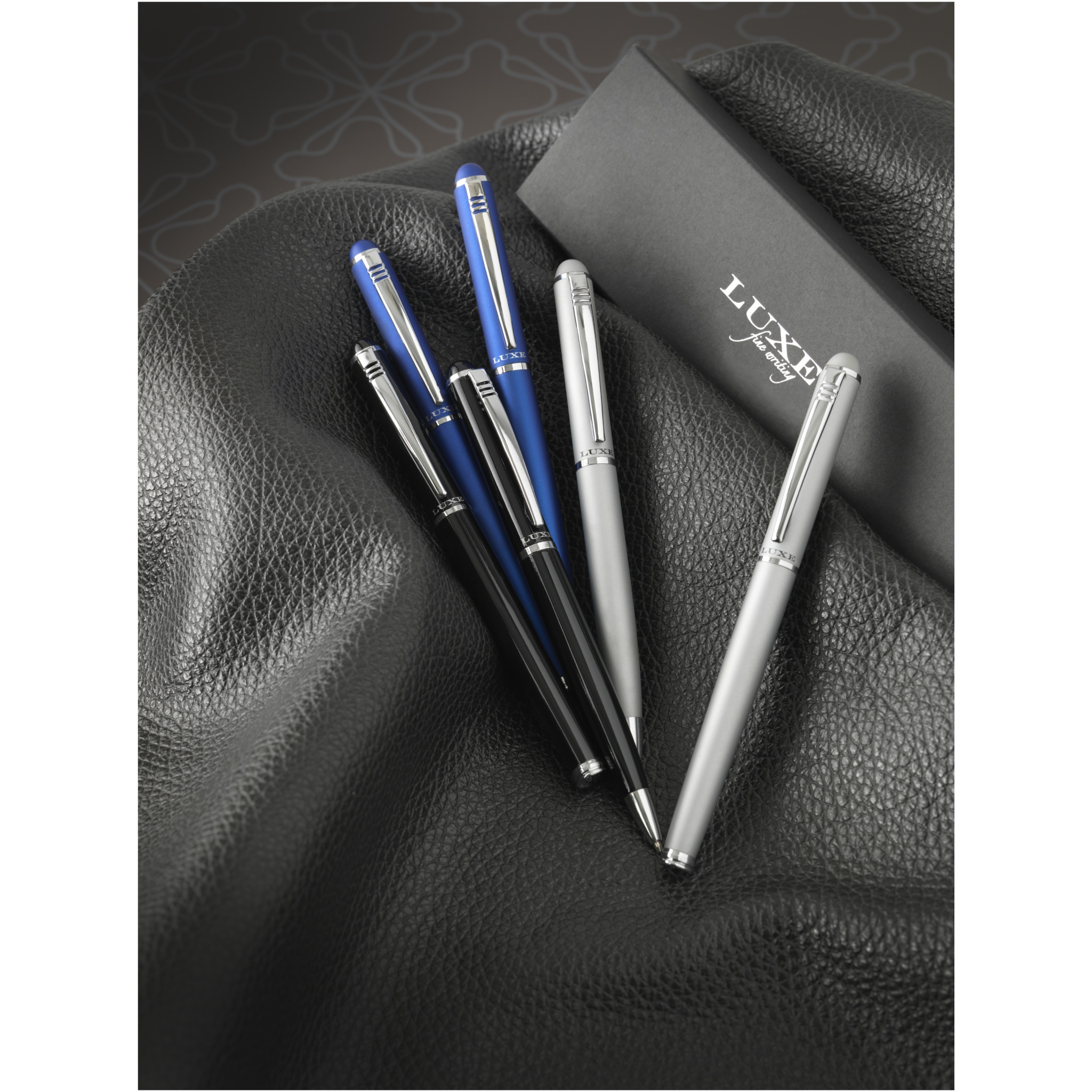 Kulspetspennor i presentask. Exklusivt designad och vridbar kulspetspenna, lock och pennuppsättning. Finns i blank svart, matt silver och matt blå. Förpackade i en lyxpresentförpackning (17 x 5,5 x 3 cm). Metall.