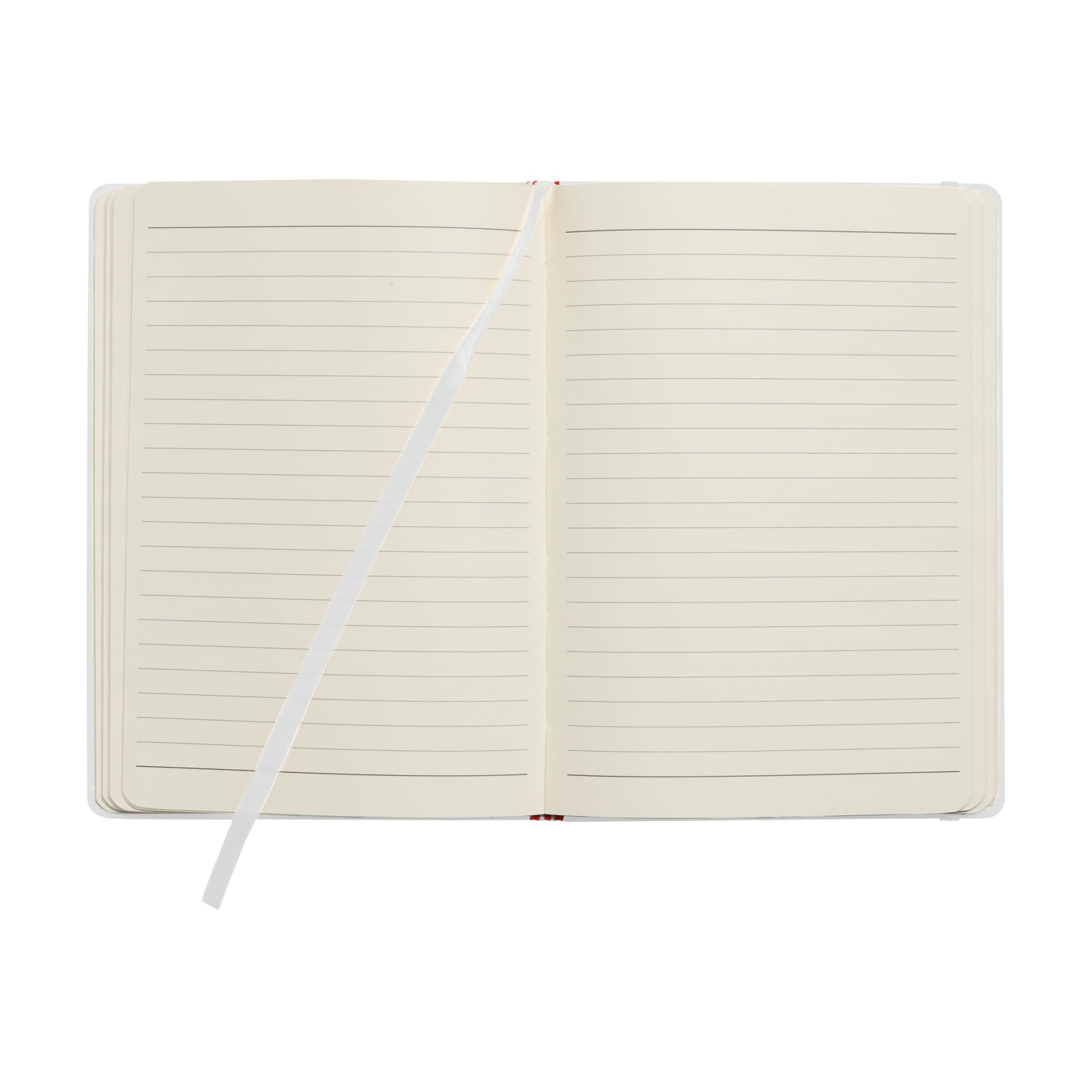 Anteckningsbok i A4-format med 96 ark/196 sidor krämfärgat, fodrat papper (80 g/m²). Med perfekt bindning, hårt omslag, elastiskt fäste och sidenband.