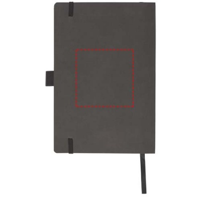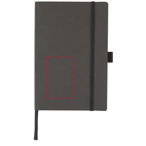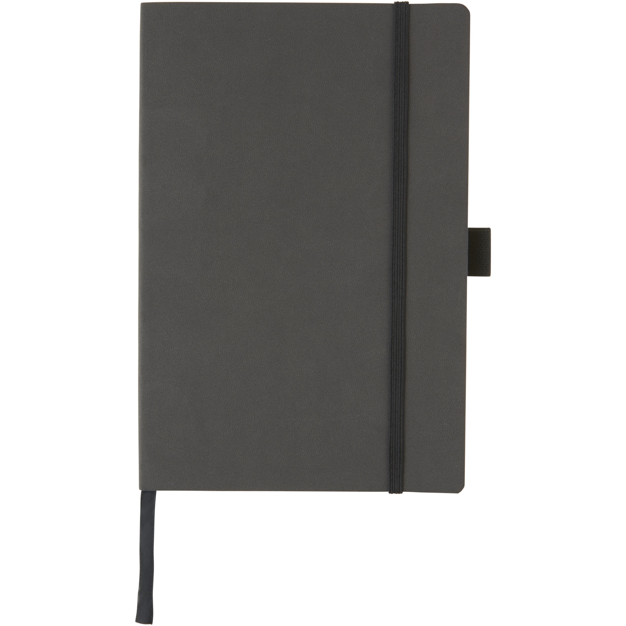 Flexibel anteckningsbok med mjuka pärmar (A5-storlek) och inbyggd elastisk stängning, sidmarkör, pennslinga, dokumentficka på bakstyckets insida och 80 ark (80 gsm) av gräddfärgat linjerat papper. Packad i ett svart omslag.