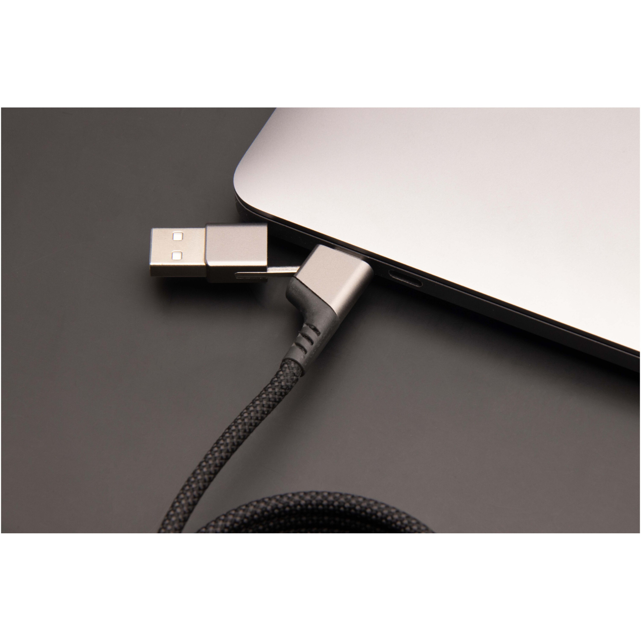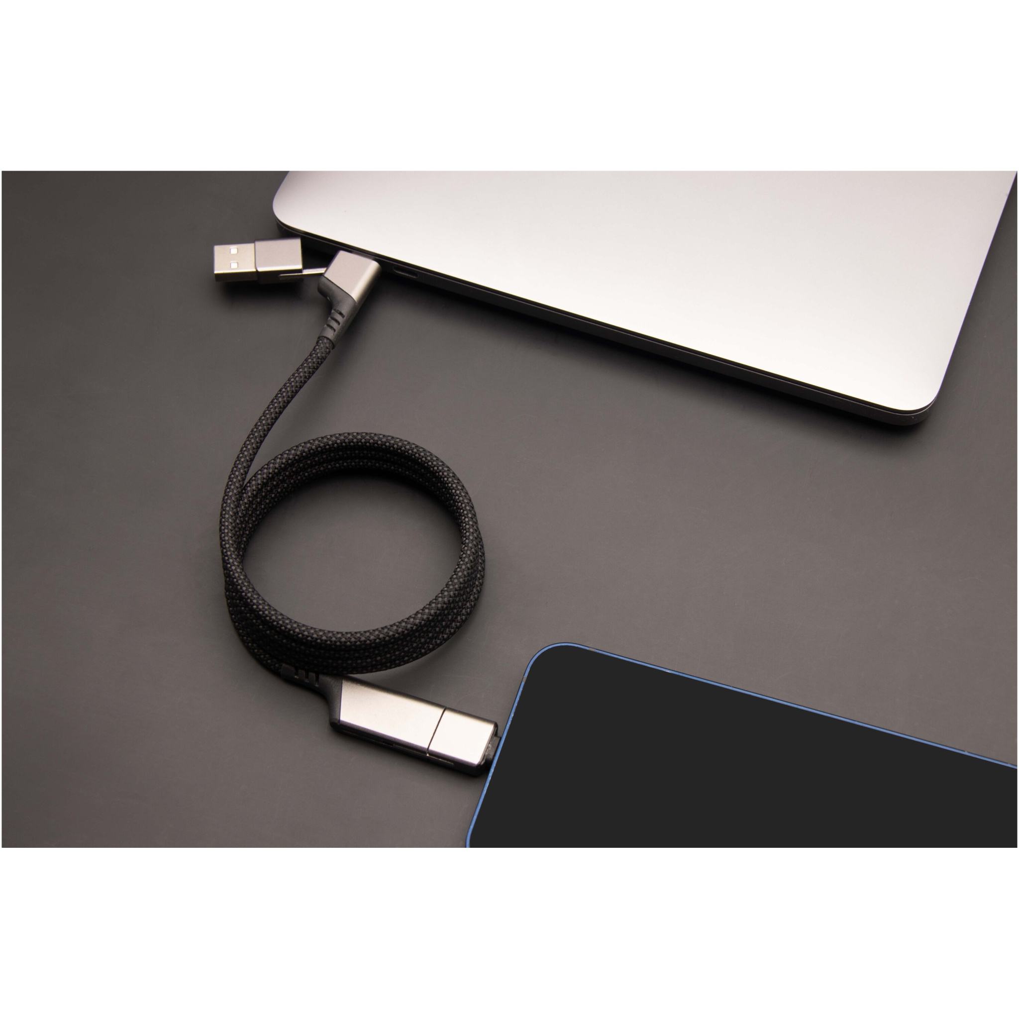 4-i-1 ultrasnabb rPET 100 W ultrasnabb magnetisk laddningskabel som kan ladda smartphones, surfplattor och bärbara datorer. Den dubbla USB-A + USB-C-ingången gör kabeln 100 % kompatibel med de senaste datormodellerna. Utgång Typ-C och lightning. Kompatibel med CarPlay. Levereras med återvinningsbar TPU-påse och en inlaga av återvunnet papper. Kabellängd: 1 meter.