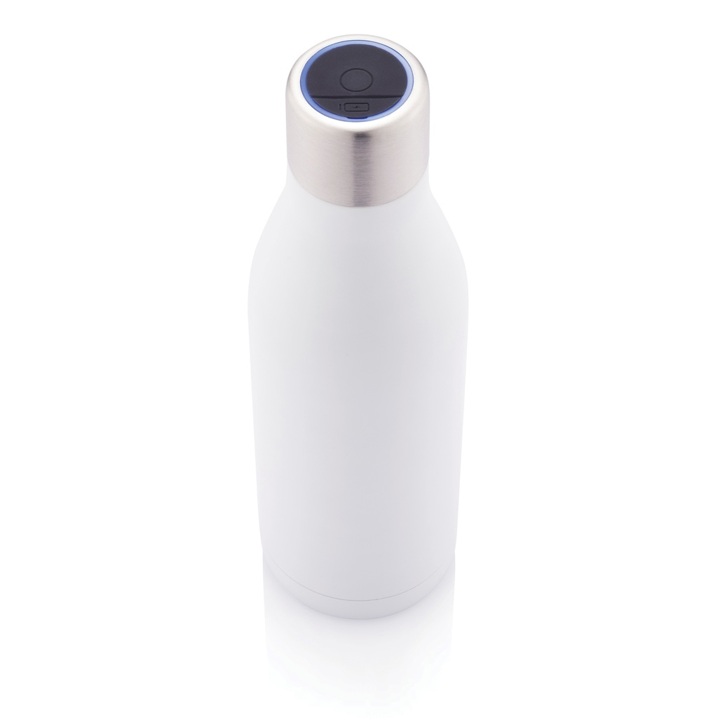 UV-C steriliserings stainless steel vakuumflaska använder intelligent UV-C LED teknologi för att rengöra ytan på insidan genom att eliminera luktframkallande bakterier och virus på runt 5 minuter. Den dubbelväggiga isoleringen håller din dryck varm i upp till 5tim eller kyld upp till 15tim. USB uppladdningsbart 180 mAh Li-polymer batteri medföljer, det är möjligt att sterilisera din flaska upp till 14 gånger på en full laddning. Volym: 500ml. BPA-fri.